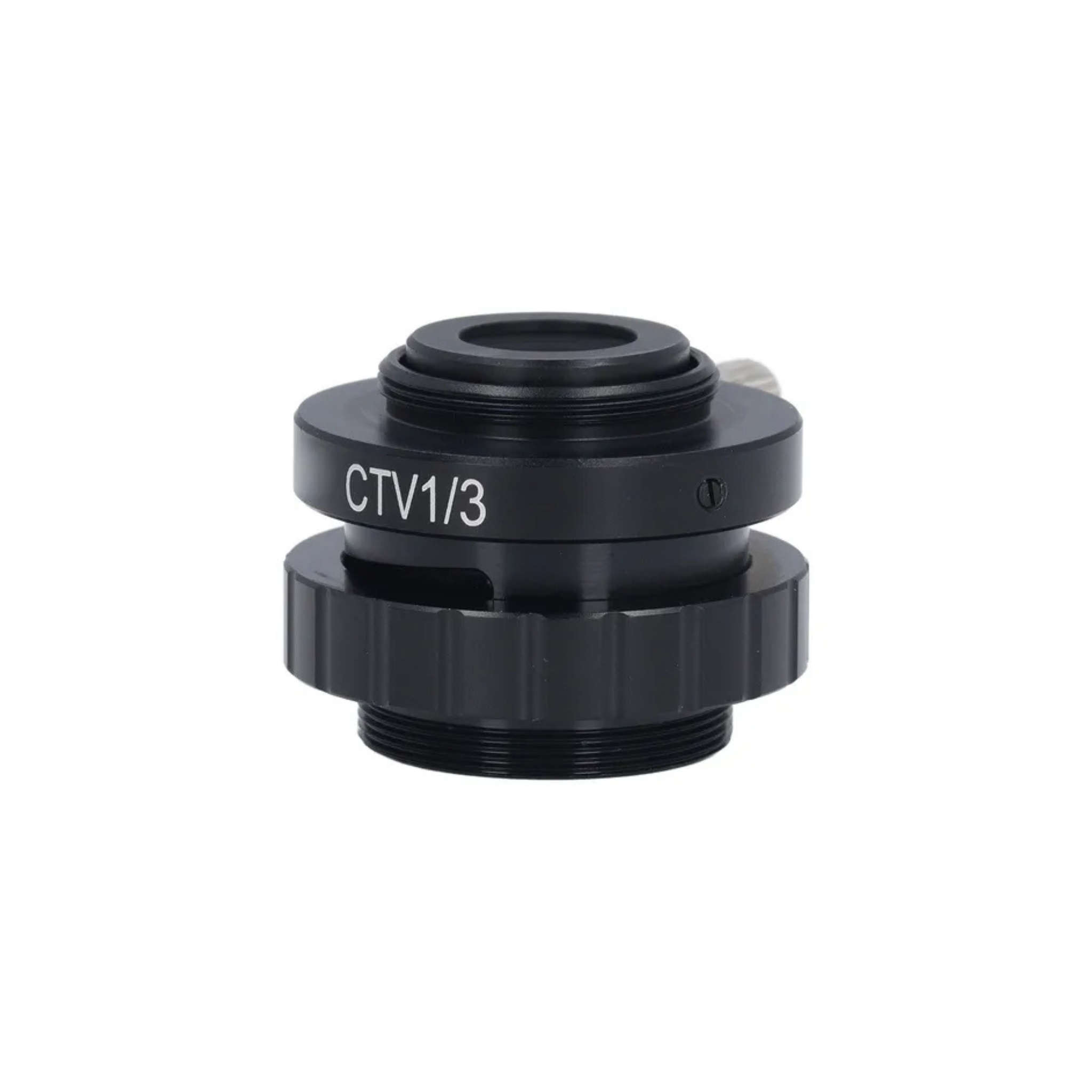 محول / قاعدة كاميرا مجهر (C‑mount adapter) مخصصة لمجاهر ثلاثية/ثنائية الرؤوس، مزودة بموضوع تقليصي 1/3 CTV (بعض الإصدارات تتضمن 1/2 CTV أيضاً)