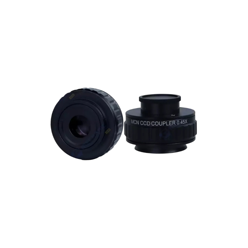 محول C‑mount 0.5× خاص بكاميرا المجهر (auxiliary objective), مصمم لتقليل التكبير بنسبة النصف، ما يوسّع مجال الرؤية (Field of View) ويزيد مسافة العمل دون تحوير البؤرة.